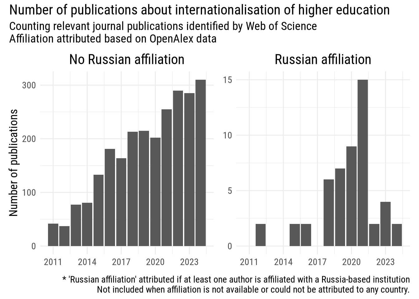 Russia-affiliated scholars publishing about internationalisation of higher education (based on Web of Science and OpenAlex)